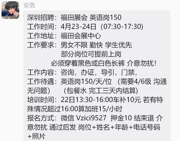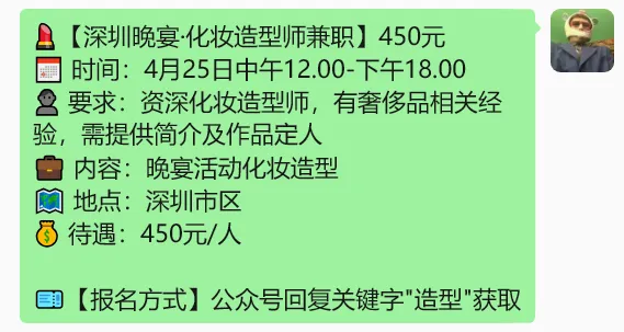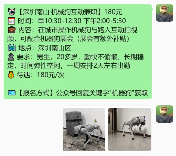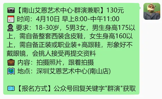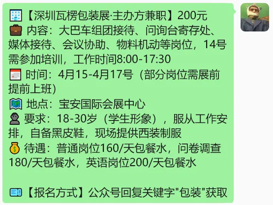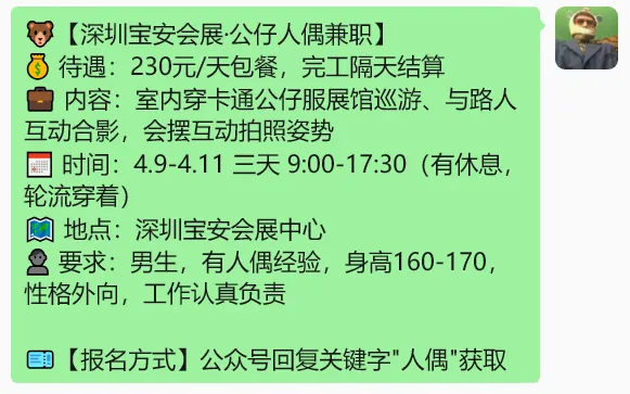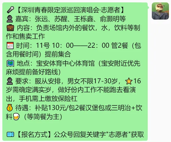 >【深圳兼职】青春限定演唱会、340元/造型师、180元/溜机器狗、230元/展会卡通人偶、400元/礼仪接待......