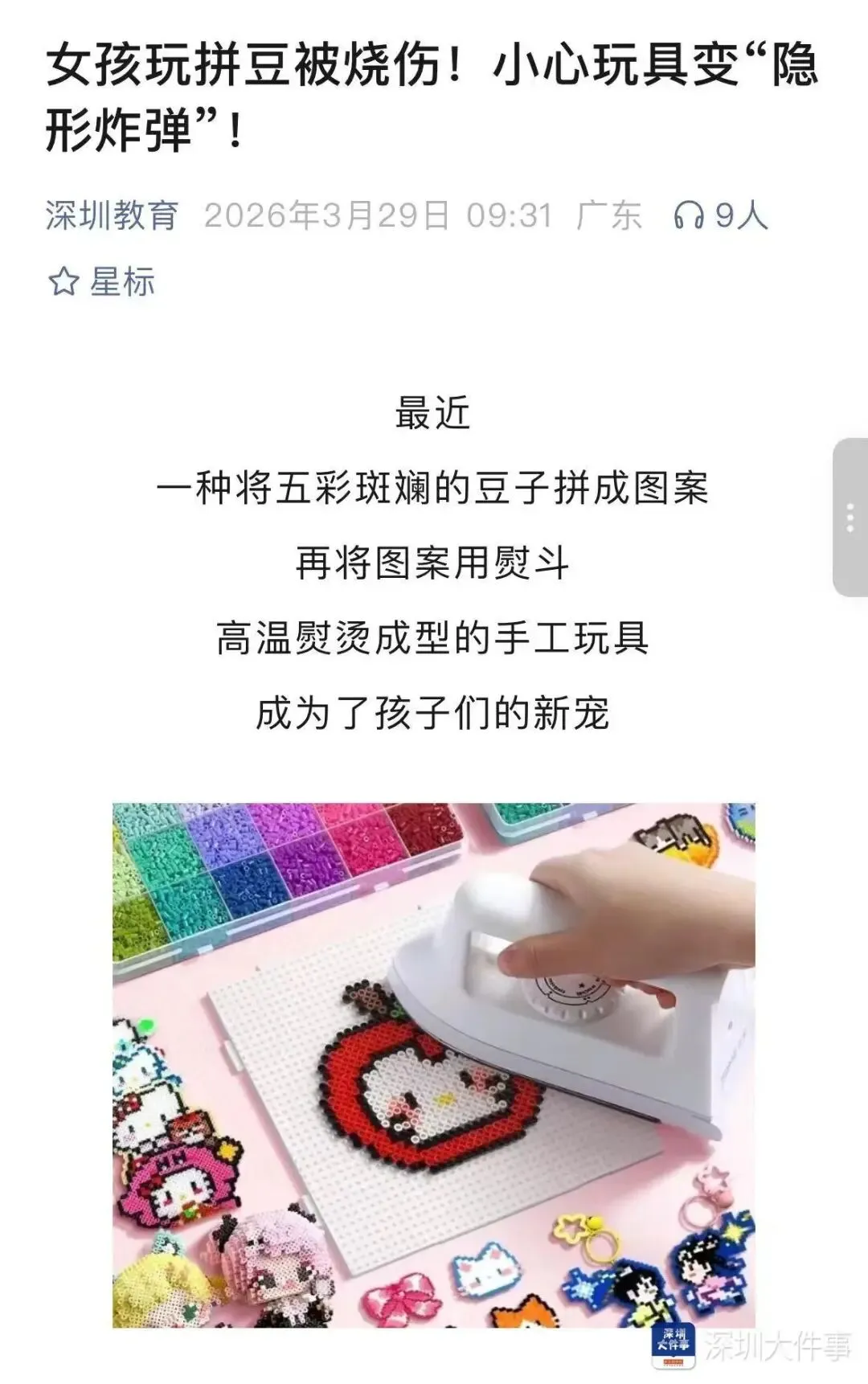 3月29日,深圳市教育局就山西女童玩拼豆遭熨斗漏电起火受伤一事发布安全警示,提醒家长警惕儿童玩具暗藏的安全隐患,切勿购买无3C认证的“三无”产品。