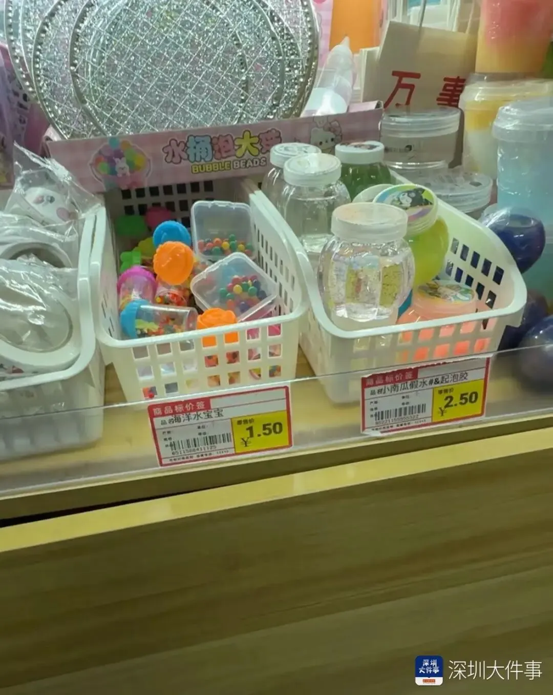 对此,南都两路记者分别前往福田区园岭小学、龙华区龙腾学校实地走访,发现两所学校校门口小卖部均在销售水宝宝、拼豆等网红玩具,这类产品大多无生产日期、无3C认证,却因趣味性强而深受中小学生追捧。