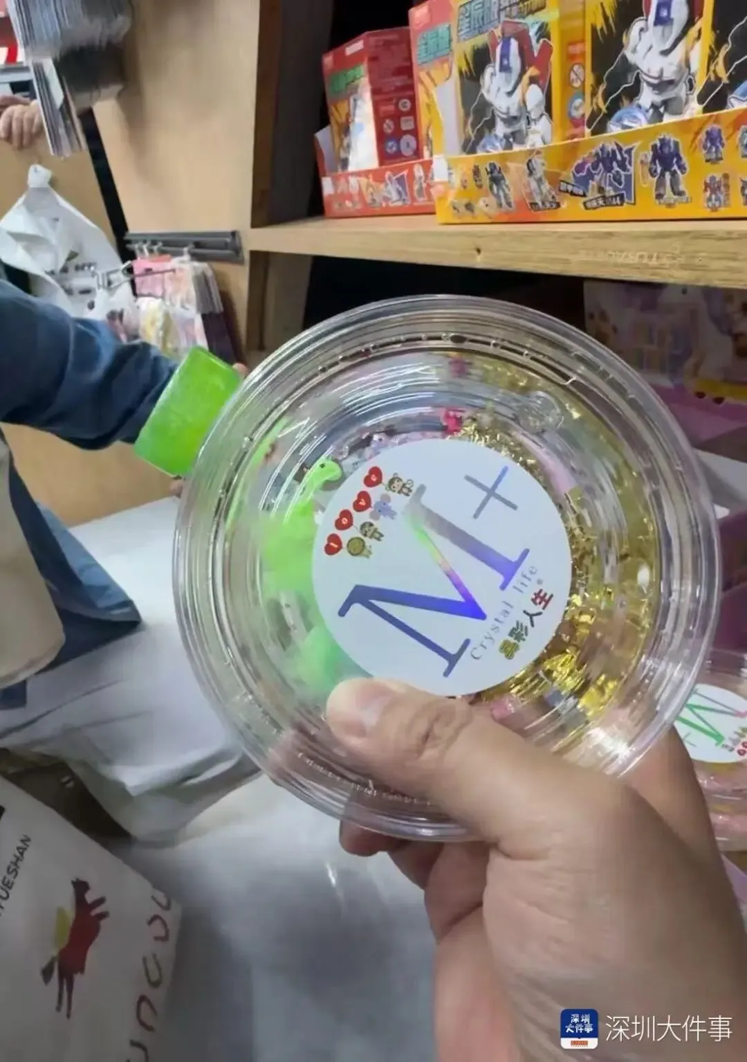 但在这家文具店,该玩具被随意摆放在低年级学生随手可及的位置。另一款被称为“水宝宝”的泡水膨胀玩具,同样是店内“热销品”。这种直径约3毫米的彩色小颗粒,泡水后会迅速膨胀成晶莹剔透的小球,深受低龄儿童喜爱。