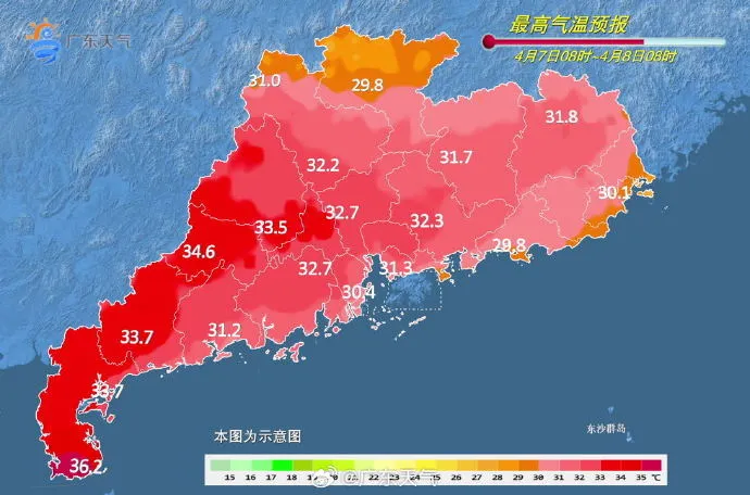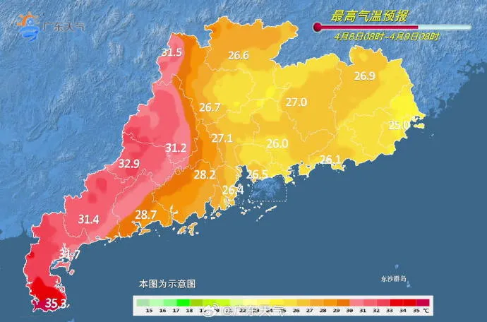 9日,全省大部多云到晴。白天最高气温:雷州半岛34-36℃,粤西其余市县和珠三角西部市县31-34℃,其余市县28-30℃。
