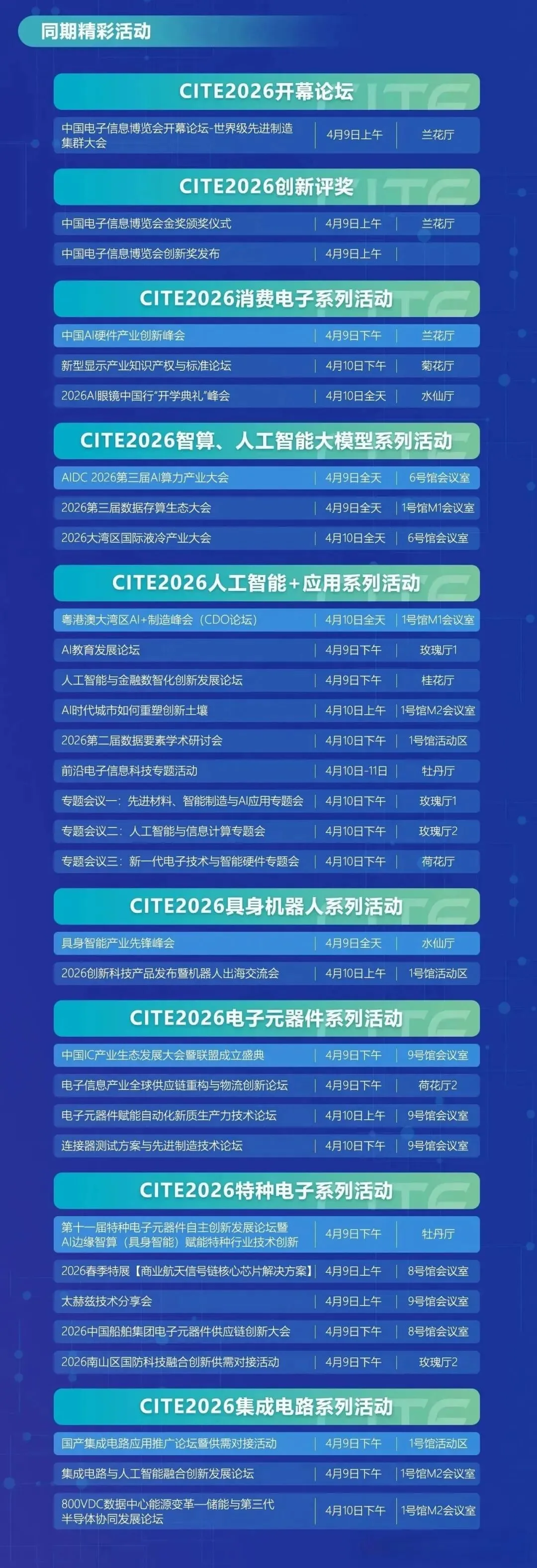 第十四届中国电子信息博览会(CITE2026)不仅是一场技术与产品的集中检阅,更是一次思想碰撞与商贸对接的顶级盛宴。展会同期将举办30余场高规格论坛活动,涵盖开幕论坛、创新评奖、消费电子、人工智能、智算中心、具身机器人、电子元器件、特种电子及集成电路等九大核心板块,汇聚全球顶尖专家、行业领袖与企业代表,围绕“新技术、新产品、新场景”主题,深入探讨产业前沿趋势、技术创新路径与生态协同发展。会议日程如下所示: