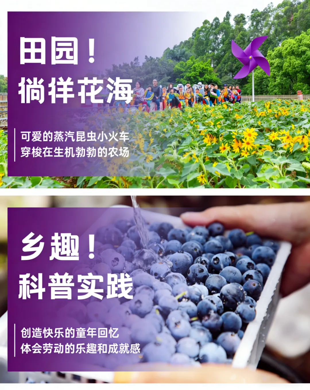 农场里展现着盎然的生机,乘坐造型可爱的昆虫小火车,徜徉在花的海洋、绿野仙镜中。