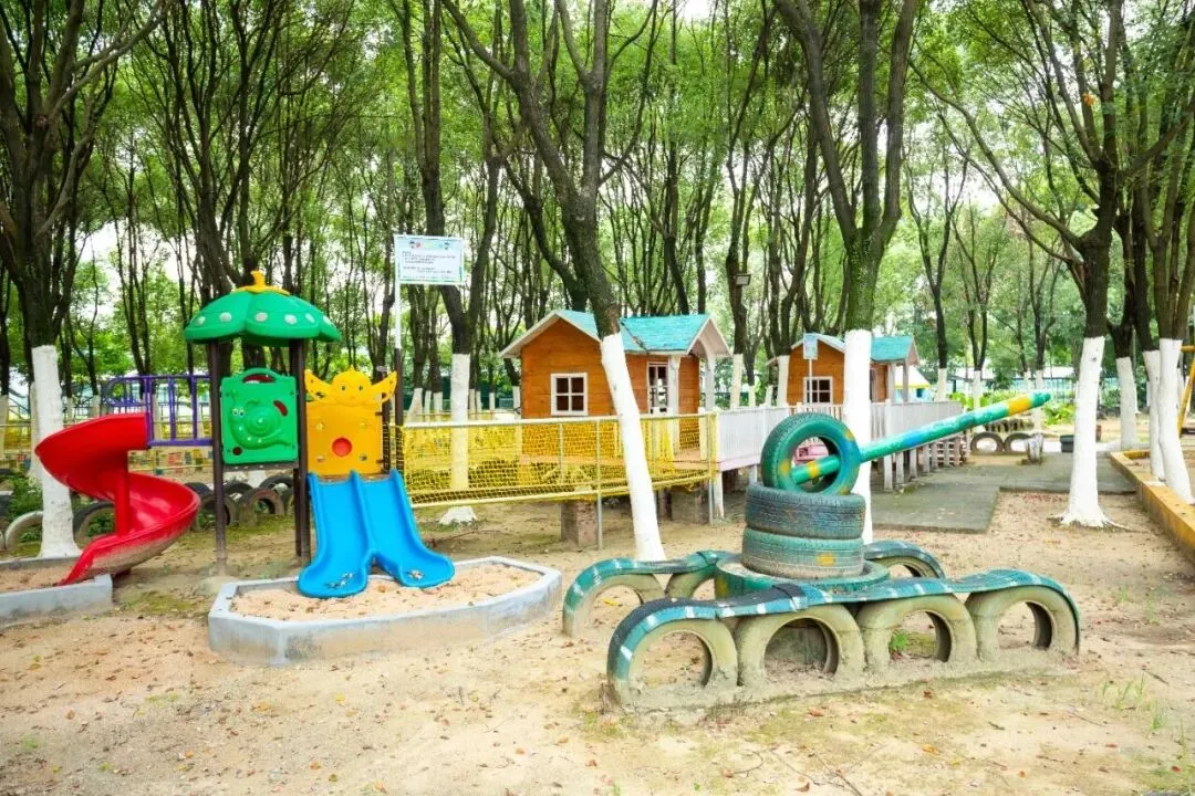 以环保为主题的童梦乐园,把废旧轮胎变废为宝,做成了各种各样的卡通人物、坦克、车子等。