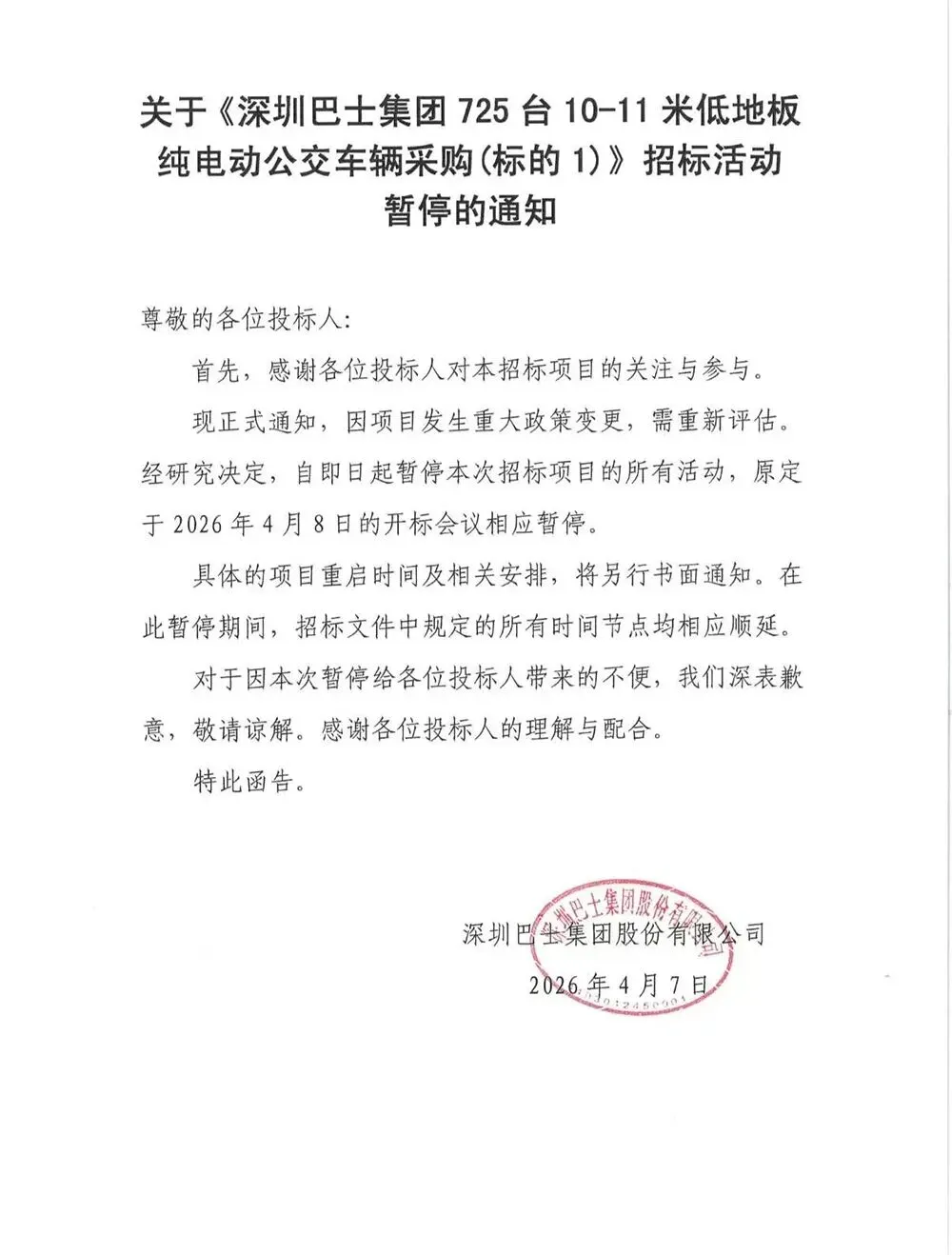 2026年4月7日,深圳巴士集团发布通知,因项目发生重大政策变更、需重新评估,即日起暂停725台10-11米低地板纯电动公交车辆采购,招标及原定于4月8日的开标会议,招标文件中所有时间节点同步顺延,具体重启时间及安排将另行书面通知。
