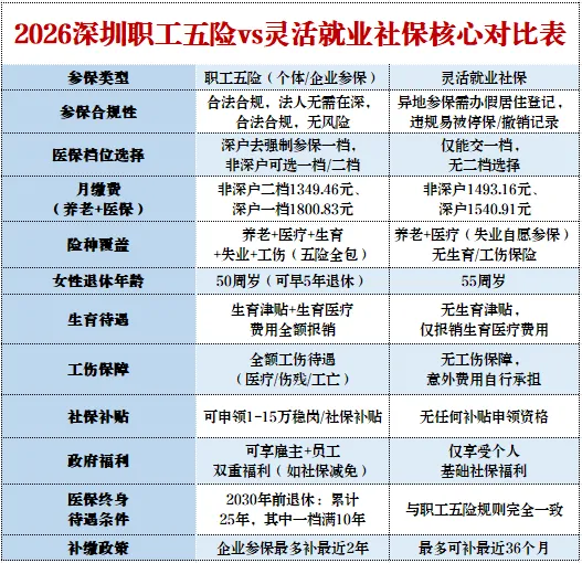 ✅️实际真相:2026 年最新缴费数据显示,深圳灵活就业非深户,仅养老 + 一档医保月缴就要 1493.16 元;而职工五险非深户二档,养老 + 医疗 + 生育 + 失业 + 工伤五险全包,全额月缴仅 1349.46 元,五险比两险还便宜 143.7 元 / 月。