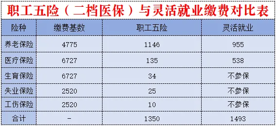 仅能选择一档医保或完全不交,无二档参保资格,单医保月缴就达 538.16 元,是职工二档医保的 4 倍左右;仅养老 + 医保这两项,灵活就业社保月缴就达 1493.16 元,比职工五险(二档医保)的全额费用还高 143.7 元,缴费劣势一目了然。