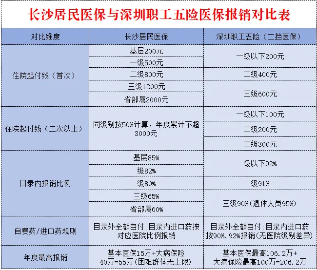 ✅️实际真相:老家居民医保需要终身缴费,况且年年涨价,最开始居民医保在03年提出的时候个人缴费的最低标准是不低于人均10元,现在全国大部分地方都涨到每年大几百了,我们就以长沙的医保为例,大家可以看数据,在三甲医院扣除起付线、自费药、自付比例后,实际报销率仅 30%-40%;而深圳职工医保交满年限即可终身享受,三甲医院住院报销 90%,连续参保满 6 年年度最高可报 206.23 万元,保障力度天差地别。