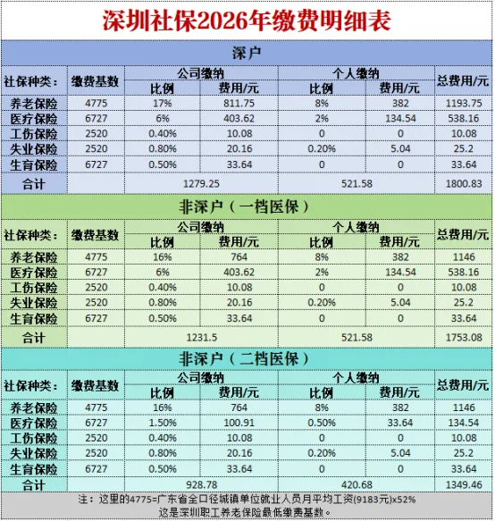 再看 2026 年深圳社保最新缴费明细,均按最低基数测算: