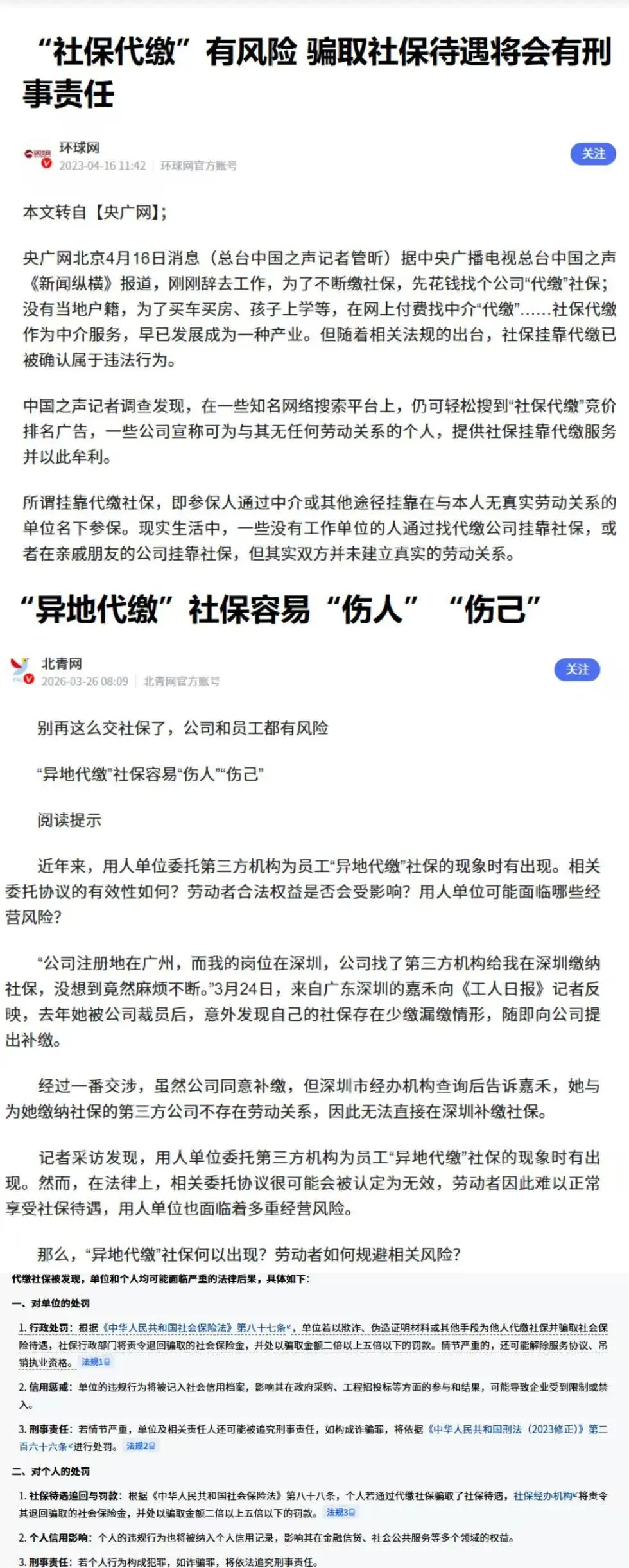 很多人误以为找第三方机构代缴社保是离职空档期的常规过渡操作,却不知道无真实劳动关系的社保代缴挂靠是国家明令禁止的违法行为,绝非打擦边球,一旦被查处,个人要承担的后果远比想象中严重,深圳社保局查实挂靠代缴行为后,会直接撤销该时段全部参保缴费记录,此前累计的社保缴费年限、个人账户余额将全部作废清零,已经申领的生育津贴、失业金、医保报销款、养老金等社保待遇会被全额强制追回,最终竹篮打水一场空。