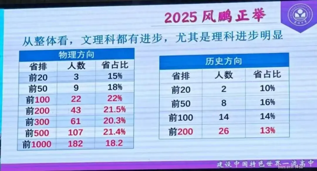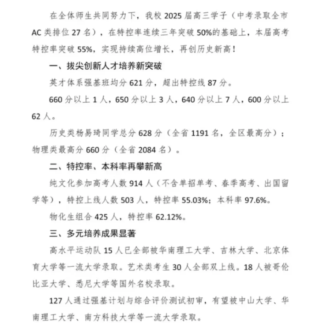 2025届纯文化特控上线超380人,纯文化特控上线率超53%,综合上线率超60%,600分以上超60人,以上三项指标均创历史新高。特控率比2024年增加15个百分点。