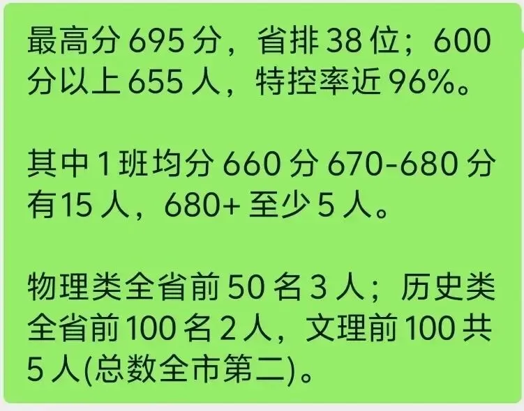 网传,600分以上30多人,特控率61.3%,历史类最高分609分,物理类最高分640分