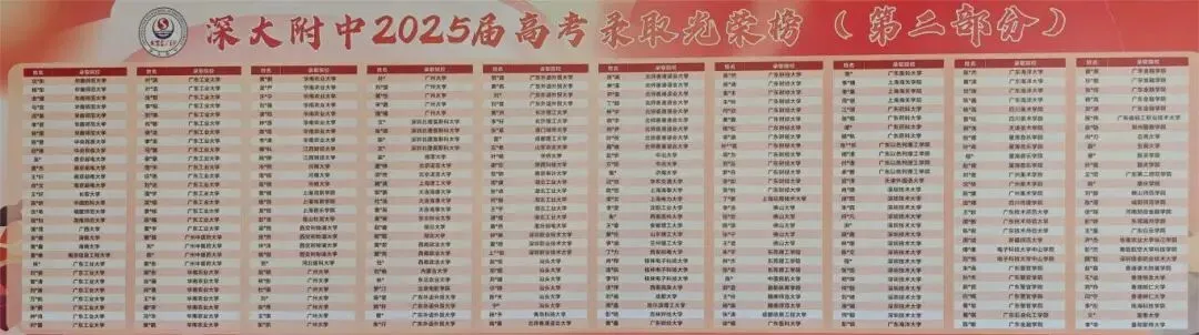 红榜公示了336名毕业生择校去向,其中电子科技大学1录取人、天津大学录取1人、北京理工大学1人、湖南大学1人、华南理工大学4人、香港中文大学1人、暨南大学8人、华南师范大学7人、深圳大学11人...