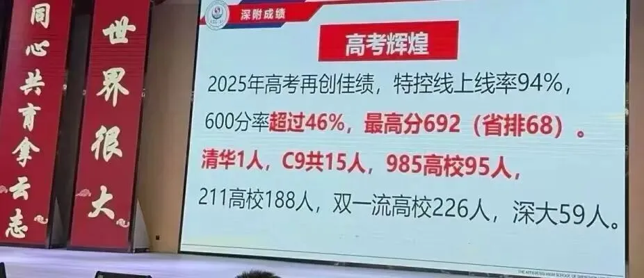 深大附中2025年高考再创佳绩,高考特控线上线率94%,600分率超过46%,最高分692(省排68),清华1人,C9共15人,985高校95人,211高校188人,双一流高校226人,深大59人。具体数据见红榜!