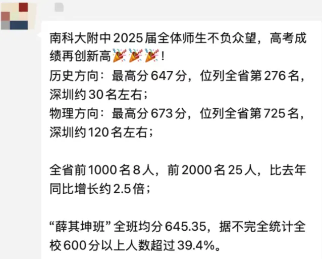 南科大附中2025届高考,历史方向最高分647分(省排276名);物理方向最高分673分(省排725名);全省前1000名8人,前2000名25人,比去年同比增长约 2.5倍。