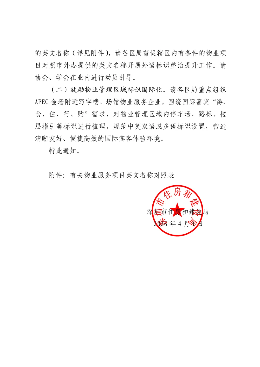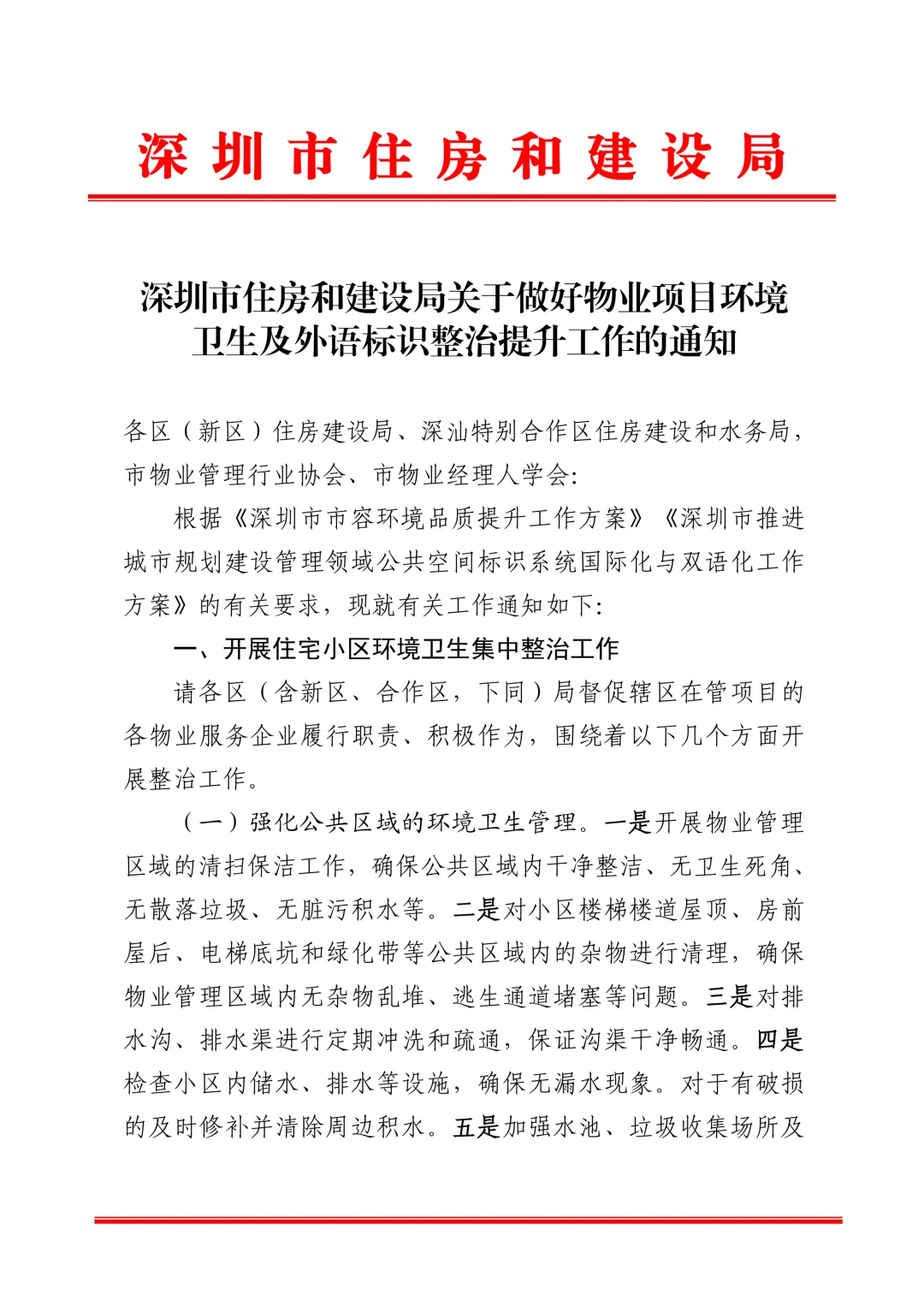 2026 年亚太经合组织(APEC)第三十三次领导人非正式会议将于 11 月在深圳举办,为全面落实市委市政府及市住建局工作部署,切实保障盛会顺利举行,市住建局已印发《深圳市住房和建设局关于做好物业项目环境卫生及外语标识整治提升工作的通知》。