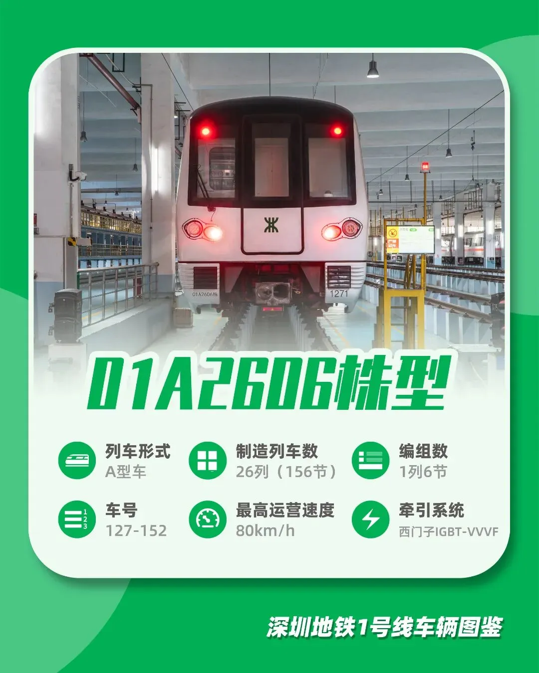 这是深圳首代90%国产化主力车型(2009年投运),26列车支撑1号线超长线路高效运营。集成西门子IGBT-VVVF牵引与电能回馈技术,智能变频空调也实现动态节能。该车型持续开展受电弓等关键系统升级,推动国产A型车技术规模化应用,保障十余年稳定运营服务。