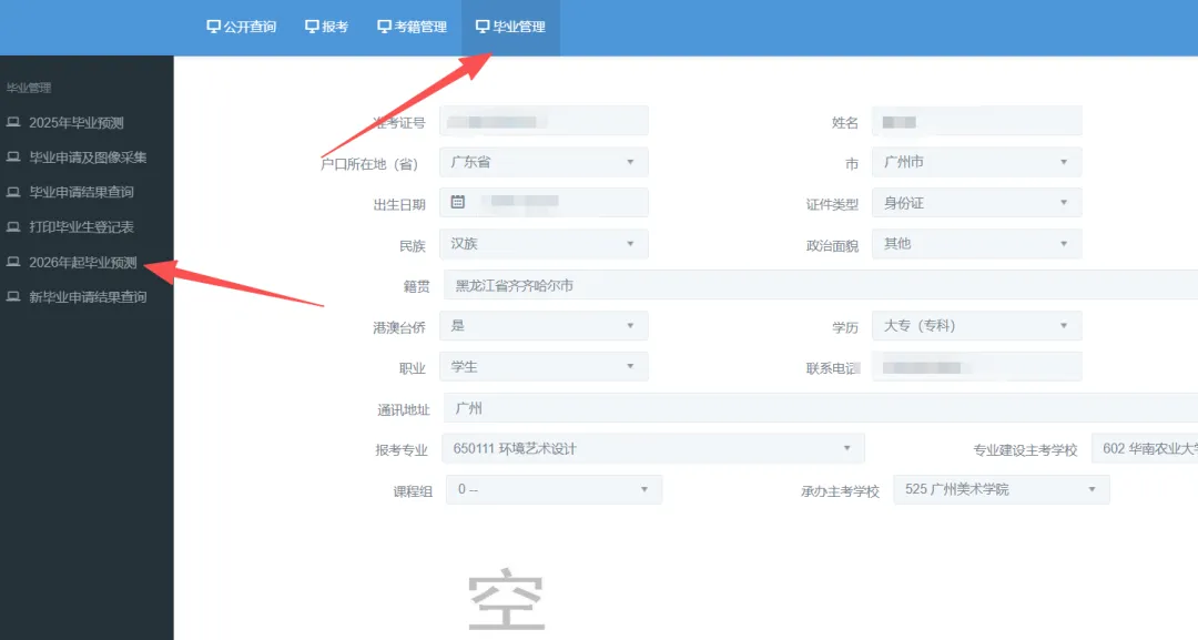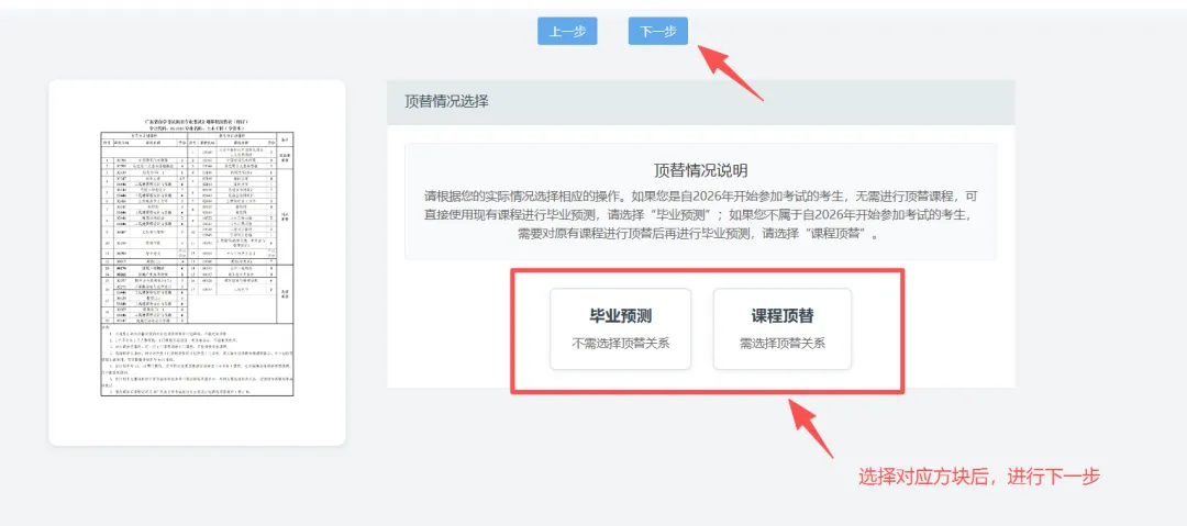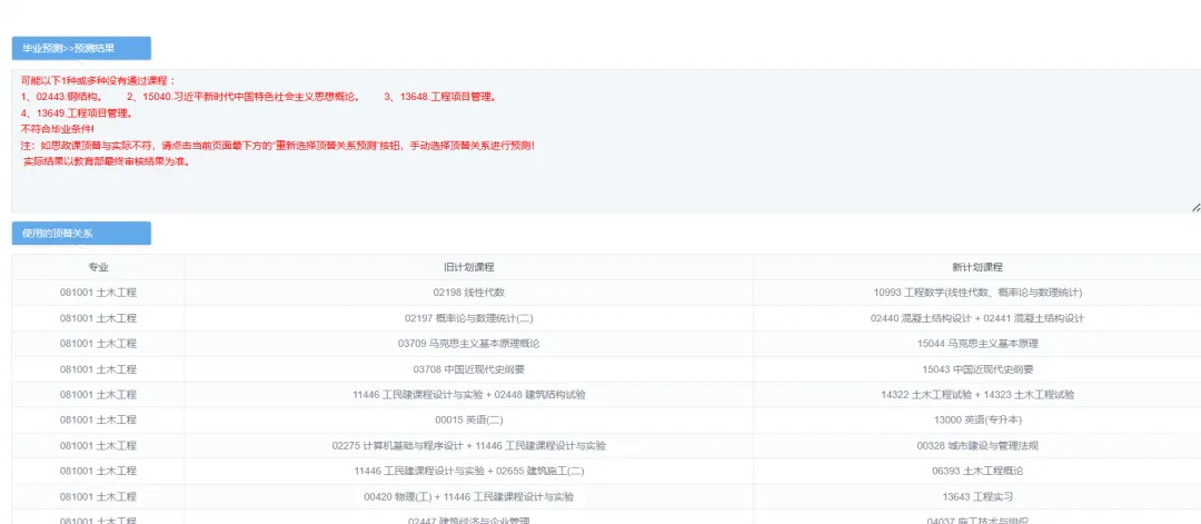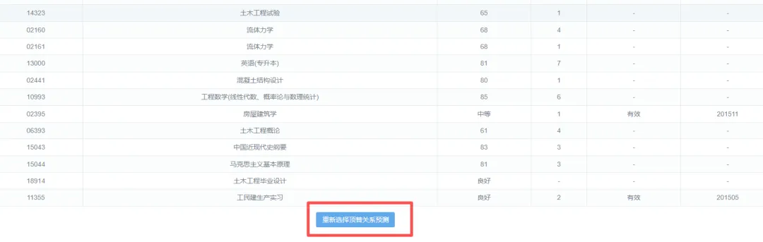 预测说明:系统会根据考生现有成绩及勾选的顶替关系对考生进行毕业预测。如不符合自身预期,则可点击页面最下面【重新选择顶替关系预测】按钮,进行重新勾选顶替关系再次预测。