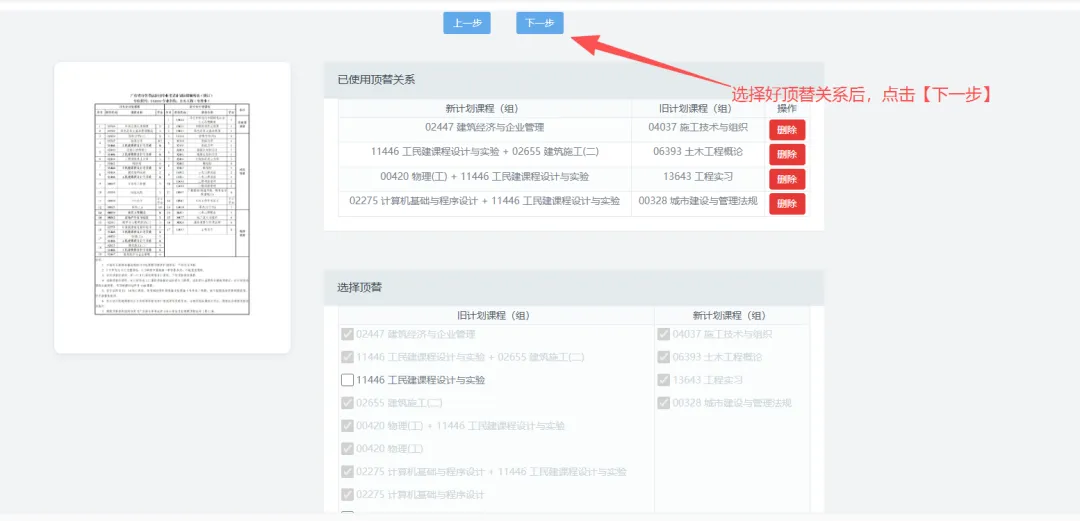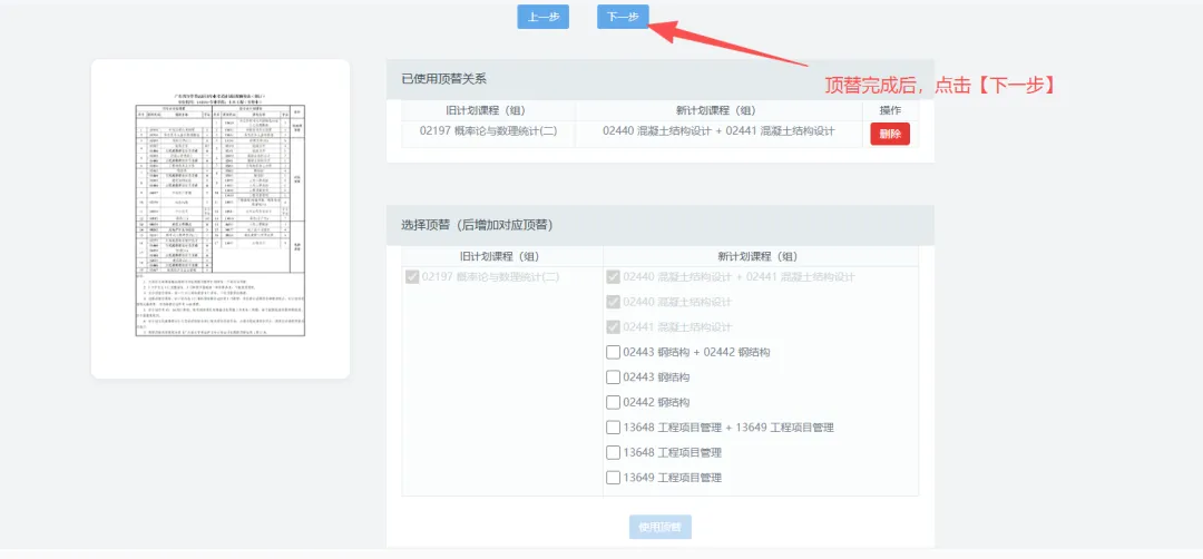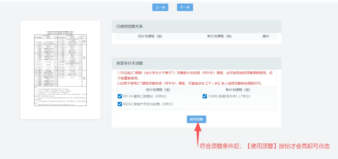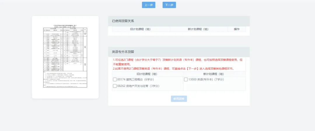 顶替说明:考生若需进行顶替,则需要勾选旧计划课程(组)中任意两门及以上且学分大于7的科目,以及勾选新计划课程(组)中的科目。