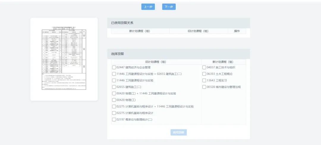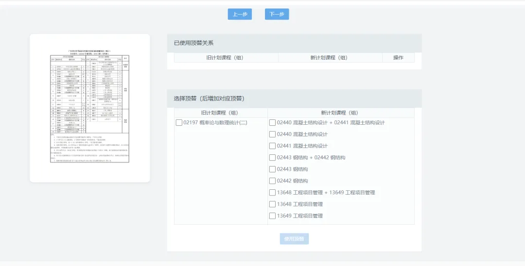 2.该项顶替中可任意选择一门旧计划课程(组)顶替任意选择一门新计划课程(组),只有当选择的情况符合要求时,“使用顶替”按钮才会亮起可点击。