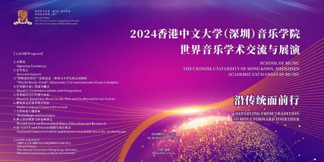 9月15日-16日,香港中文大学(深圳)音乐学院在党的二十届三中全会胜利召开之后,以及香港中文大学(深圳)建校十周年之际,策划并成功举办了“世界音乐学术交流与展演”。大会旨在全面加强我院与世界各国音乐家和音乐学者的联系,增进我国与世界各国的音乐交流,从而促进世界音乐多元发展,建立中国、西方与世界三元并立的音乐格局,实现音乐互融互通互享互鉴,使音乐成为不同文化、不同人群互相了解与沟通的桥梁。同时,本次大会的成功举办也进一步拓宽了学院的国际化学术视野,为包容多元化的音乐世界,配合落实国家的“一带一路”倡议,对世界的“多元文化交流”做出了积极贡献,文明互鉴,艺术共赏。