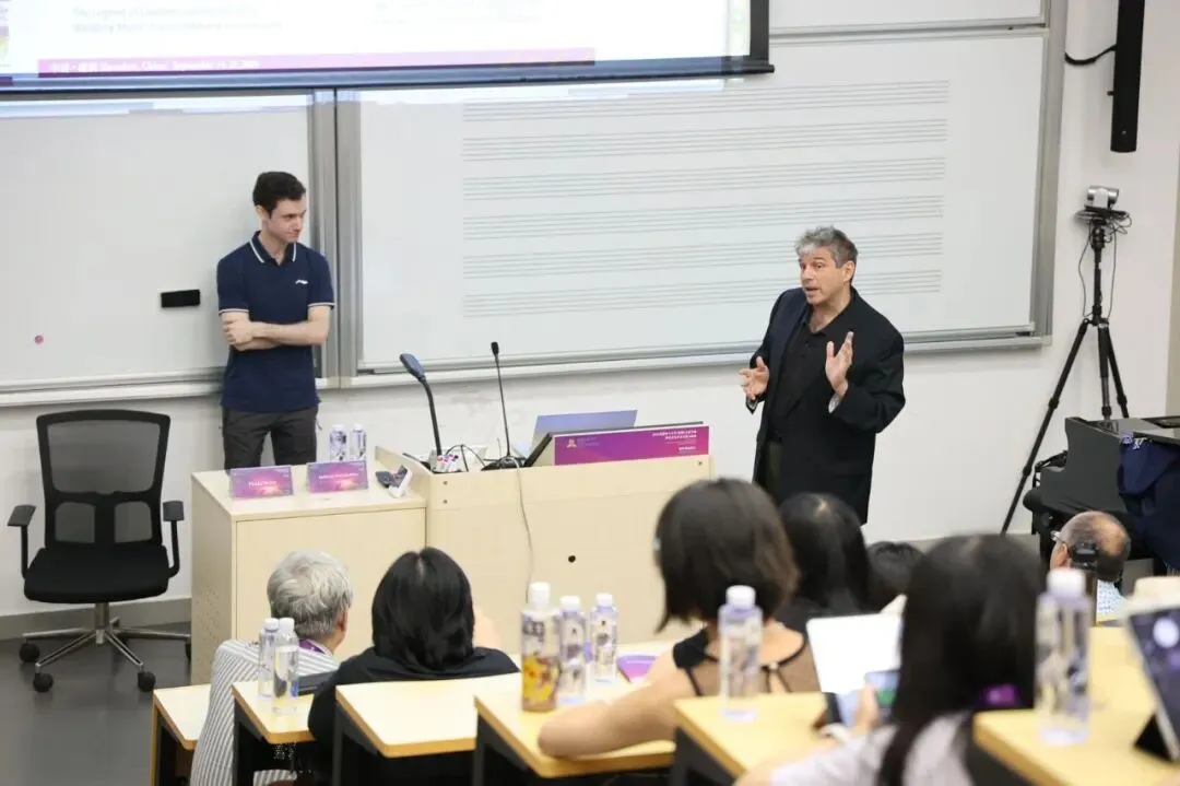 第一场讲座中,由我院讲师Paulo Brito博士主持,美国东北大学教授Antony Paul De Ritis与大家深入探讨了中国乐器在西方音乐创作中的独特角色与影响。他分享了自己在《Zhongguo pop》中的创作经历,和以中国神话“牛郎织女”为灵感创作的两段音乐作品的创作过程。