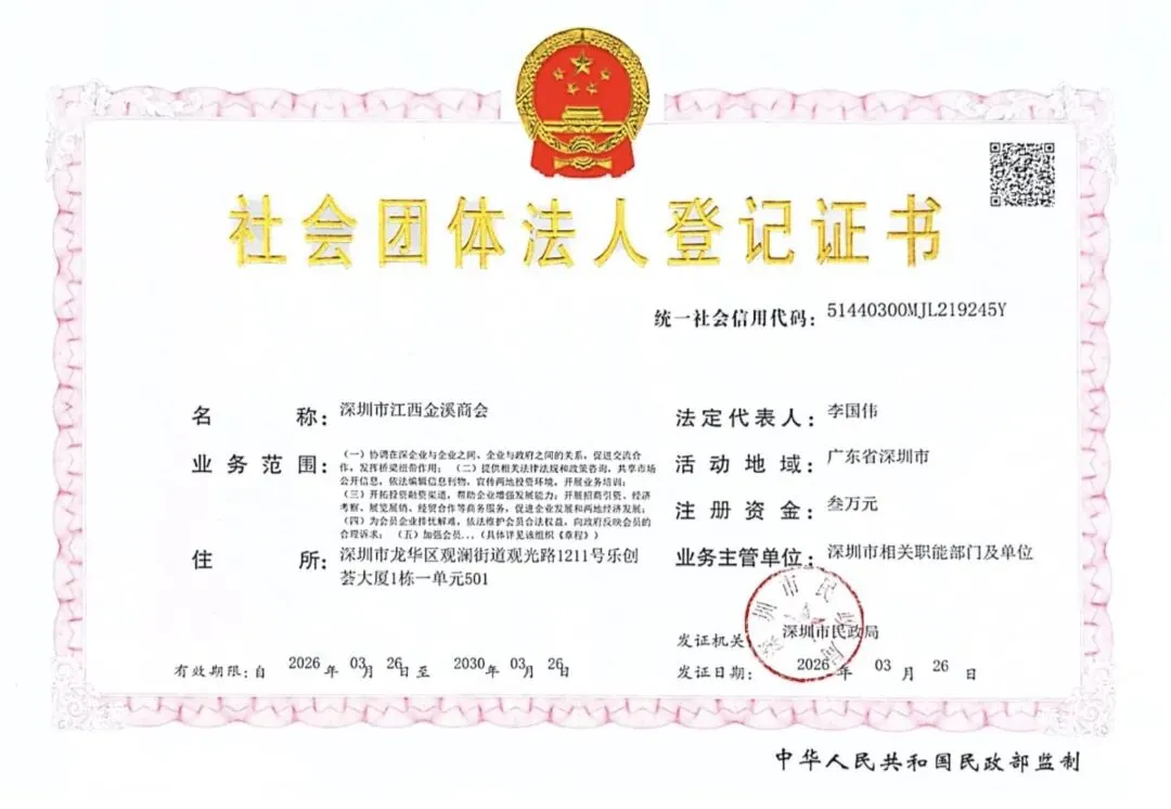 深圳市江西金溪商会经深圳市民政局社会组织管理局批准,于2026年3月26日正式登记成立,是由江西省抚州市金溪籍自然人或法人在深圳市投资兴办、并经深圳市市场监督管理部门登记注册的各类企业自愿发起组成的,具有地方性、联合性和非营利性的社会团体。