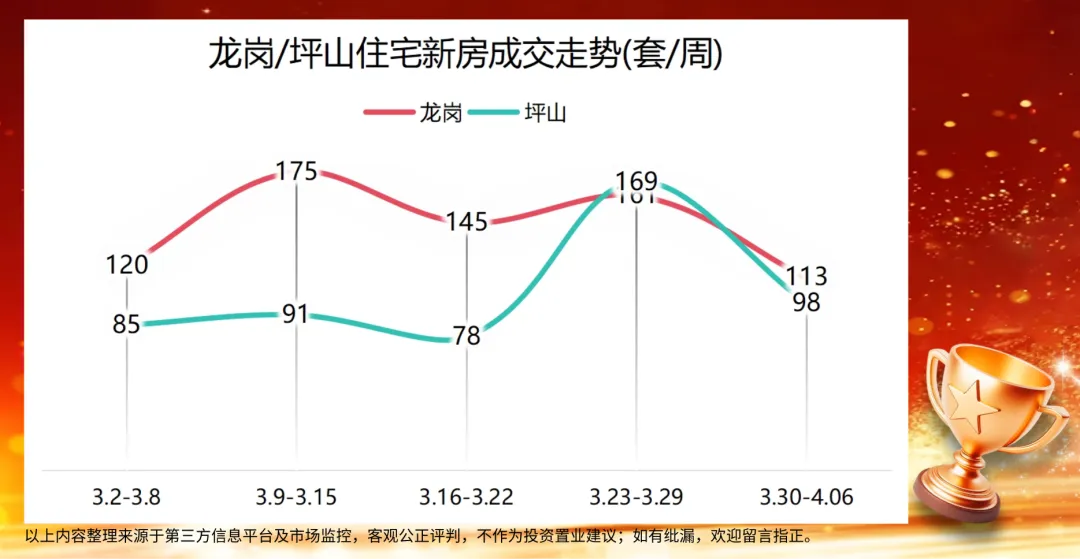 其中,龙岗区新建商品住宅成交 113 套,环比下降约 29.8%;坪山区成交 98 套,环比下降约 42%。