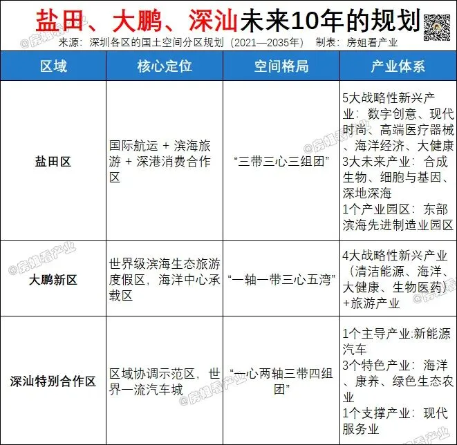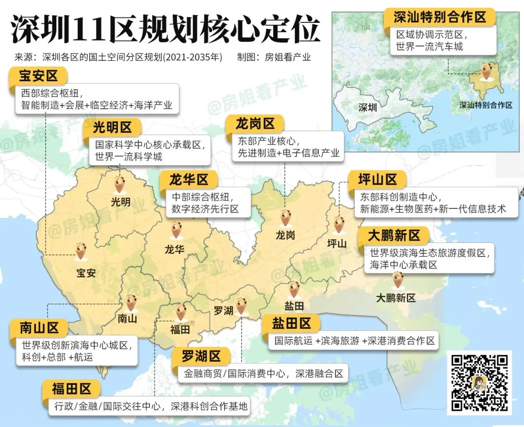 简单捋一下:福田、罗湖、南山这三个核心区,主攻金融、科创和消费;宝安、龙岗、龙华、坪山、光明这五个产业大区,主攻先进制造和数字经济;盐田、大鹏和深汕,则负责海洋、旅游和汽车这些生态+飞地板块。