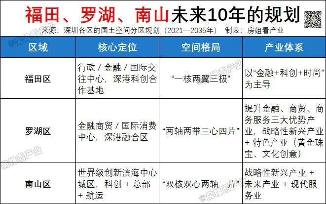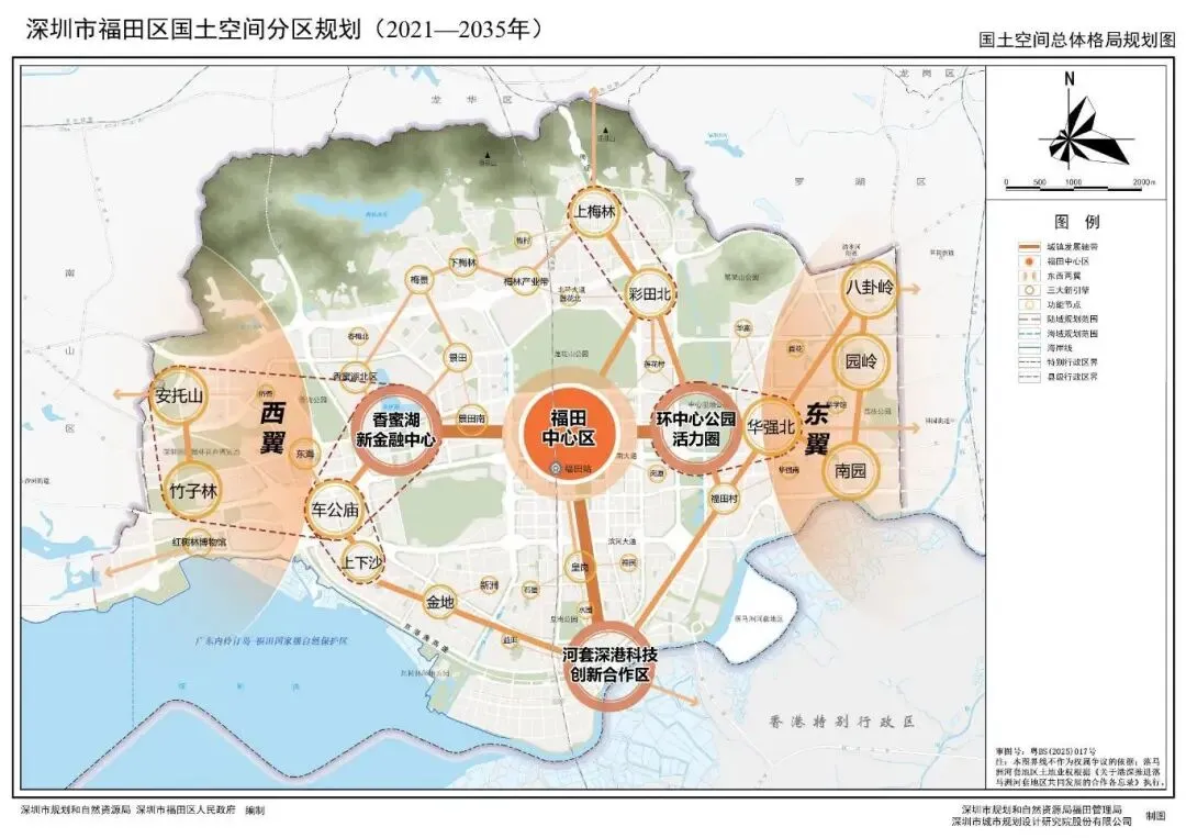 ——行政、文化、金融商务、国际交往中心,也是现代服务业和文化创意产业的集聚区,还是深港科技合作的基地。目标是到2035年,搞出一个“金融+科创+时尚”的产业体系,成为世界级湾区的产业引领区。到2050年,要建成全球标杆城市的先锋区。空间上,福田画了个“一核两翼三极”的棋盘:福田中心区是核,河套和香蜜湖是两翼,河套深圳园区、梅林—彩田、福田保税区是三极。产业上就三个关键词:金融、科创、时尚。