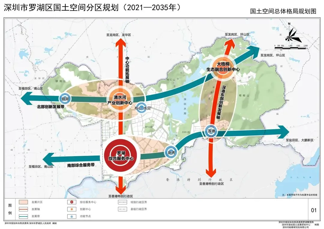 ——定位是金融商贸中心、国际消费中心,也是区域交通枢纽、现代服务业和创新创意产业的集聚区,还是深港深度融合发展区。空间格局叫“两轴两带三心四片”:两轴是中心功能拓展轴和深港东部创新发展轴;两带是南部综合服务带和北部创新发展带;三心是罗湖综合服务中心、清水河产业创新中心、大梧桐生态融合创新中心;四片是银湖、布心—水贝、新秀、莲塘。产业上,金融、商贸、商务服务这三大优势产业要提档升级,软件信息、现代时尚、大健康、数字创意这些新兴产业也要发力,黄金珠宝和文化创意也不能落下。