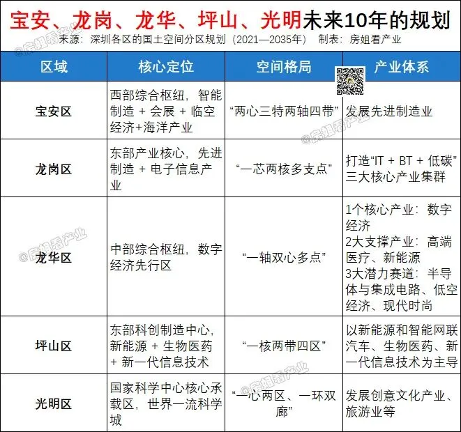 产业五强:宝安、龙岗、龙华、坪山、光明