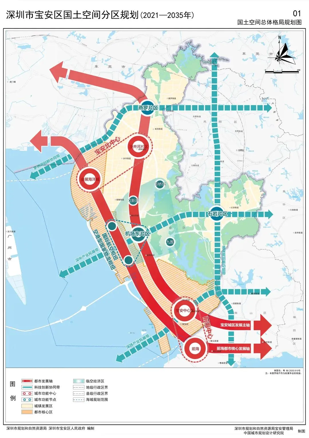 ——西部区域的综合服务中心,也是综合交通枢纽,智能制造、国际会展、临空经济和海洋产业的集聚区。空间格局叫“两心三特两轴四带”:两心是前海中心和宝安北中心;三特是机场东、燕罗、石岩;两轴是前海都市核心发展轴和宝安城区发展主轴;四带是茅洲河创新协同带、深中产业拓展带、深珠产业拓展带、港深莞创新功能带。