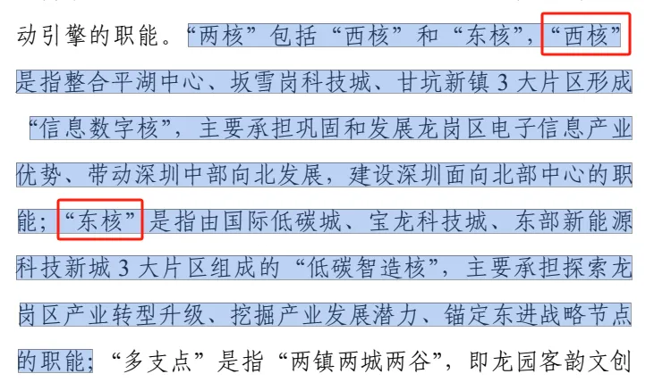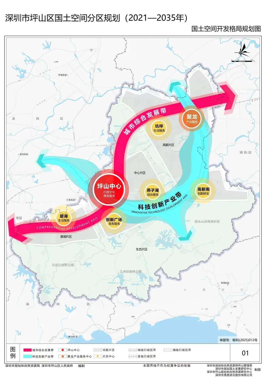 ——东部区域的产业科技创新中心,也是综合交通枢纽、未来产业试验区,高新技术产业和先进制造业的集聚区。空间格局是“一核两带四区”:一核是坪山中心;两带是城市综合发展带和科技创新产业带;