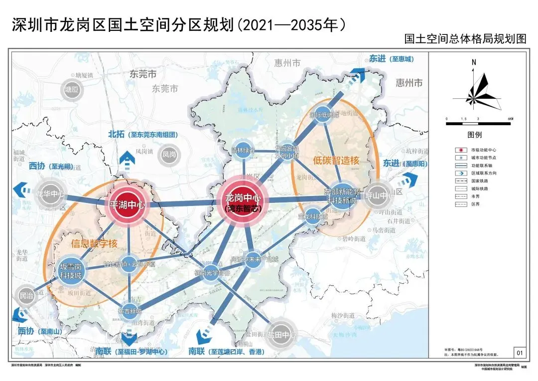 ——东部区域的综合服务中心,也是国际合作高等教育和文化体育交流中心,电子信息产业高地和先进制造业集聚区。空间格局是“一芯两核多支点”:一芯是“湾东智芯”,由大运深港国际科教城和龙岗中心城组成;