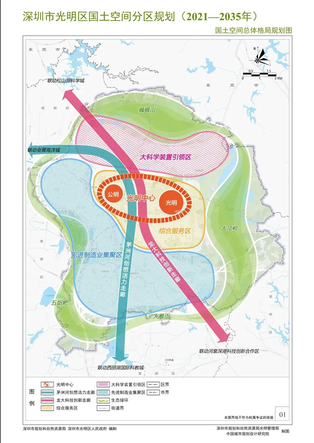 ——综合性国家科学中心核心承载区,也是科研经济集聚区、绿色发展示范城区、国际人文宜居城区。空间格局是“一心两区、一环双廊”:一心是光明中心;两区是大科学装置引领区和先进制造业集聚区;一环是以森林公园和绿色田园为主体的生态绿环;