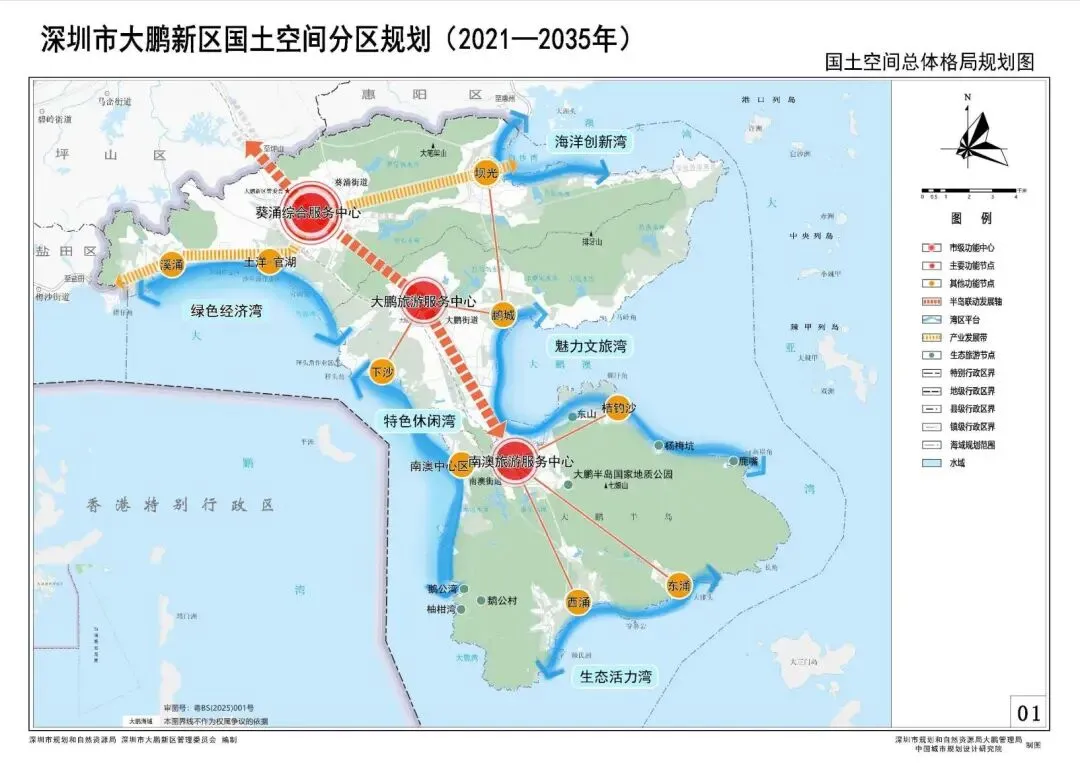 ——世界级滨海生态旅游度假区,全球海洋中心城市集中承载区,绿色低碳发展试验区,滨海旅游服务中心。空间格局是“一轴一带三心五湾”:一轴是半岛联动发展轴;一带是盐坝产业融合发展带;三心是葵涌综合服务中心、大鹏旅游服务中心、南澳旅游服务中心;