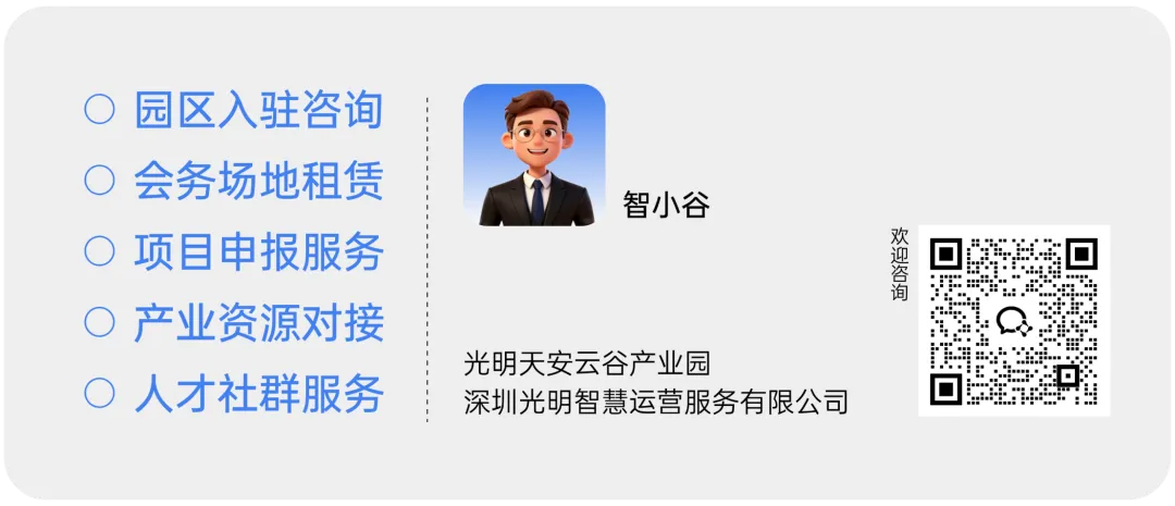 光明天安云谷作为光明科学城综合配套区,以“产业运营+生态赋能”为核心,构建了覆盖企业全生命周期的专业化服务体系,为入驻企业和团队提供“空间+资本+技术+人才”四位一体的深度支撑,助力创新成果快速转化、企业高效成长。