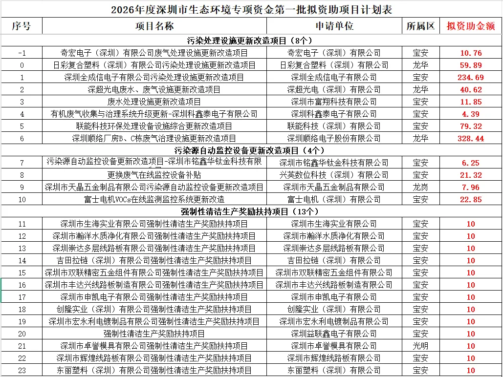 关于2026年度深圳市生态环境专项资金第一批项目公示名单