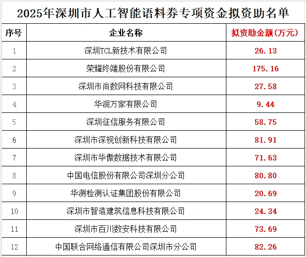 关于2025年深圳市人工智能语料券专项资金拟资助公示名单