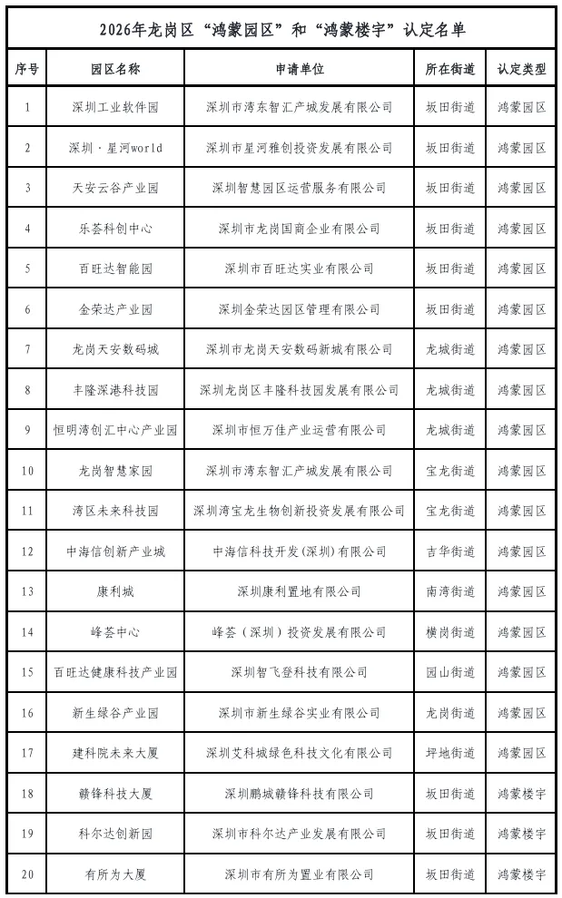 关于2026年龙岗区“鸿蒙园区”和“鸿蒙楼宇”认定名单公示