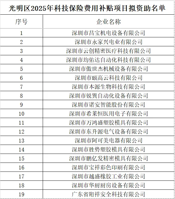 关于光明区2025年科技保险费用补贴项目名单公示