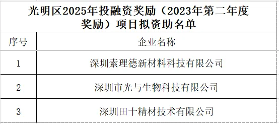 关于光明区2025年投融资奖励(2023年第二年度奖励)项目名单公示