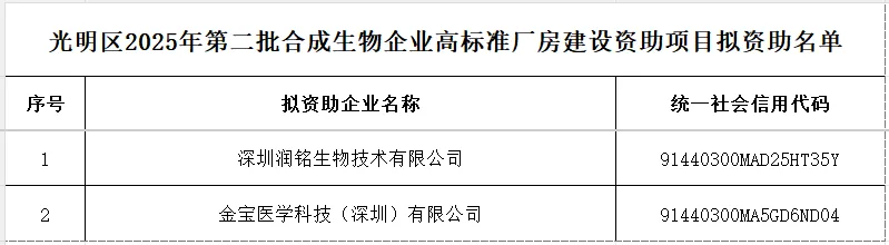关于光明区2025年第二批合成生物企业高标准厂房建设项目名单公示