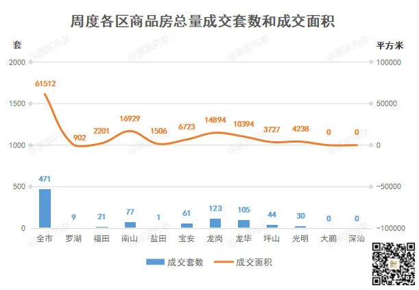 深圳全市开发商品房共成交471套,环比↓6.73%;成交面积61512.28㎡,环比↑10.16%。其中:
