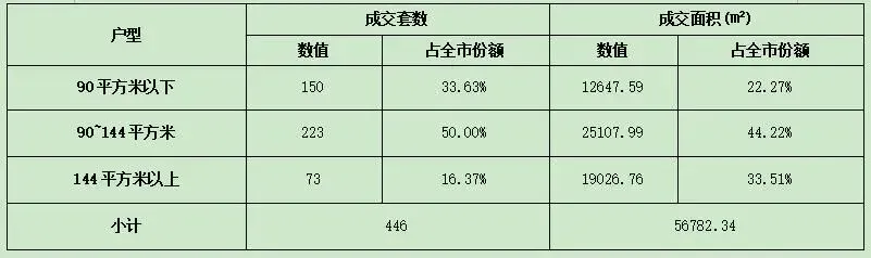 ①住宅,成交446套,环比↓6.30%;成交面积56782.34㎡,环比↑7.28%;