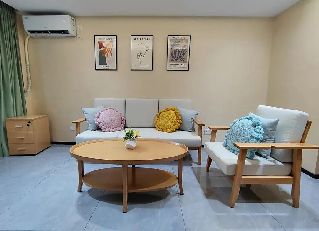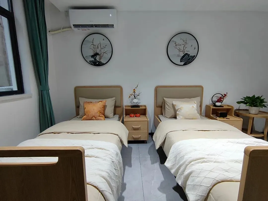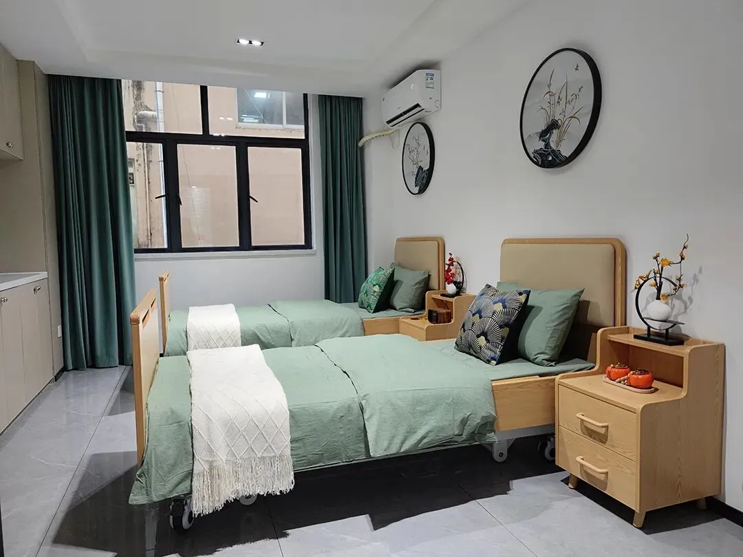 双人自理间配备了老人生活必须的家具产品,包含适老自理床、床头柜、沙发、茶几、储物柜、衣柜等。我们可以看到自理床尾板设有挖孔扶手,行动不便、体弱的老人可以在行走过程中借力撑扶。