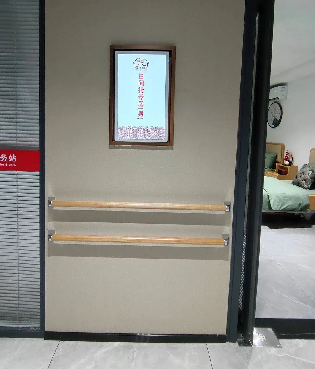 过道墙上安装有双层扶手,让站立和坐轮椅的老年人都能够借助扶手助力行动。