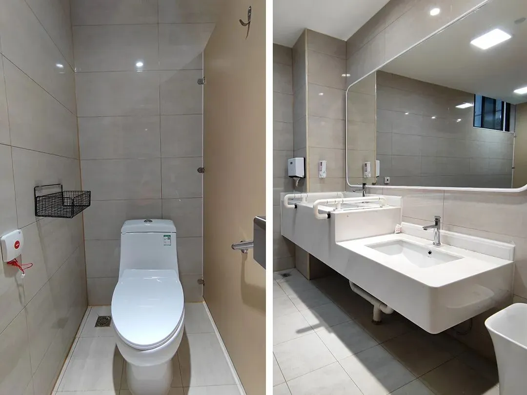 卫生间是适老化程度最多的地方,它安装了安全扶手、报警器、高低洗手台盆、台盆扶手等。