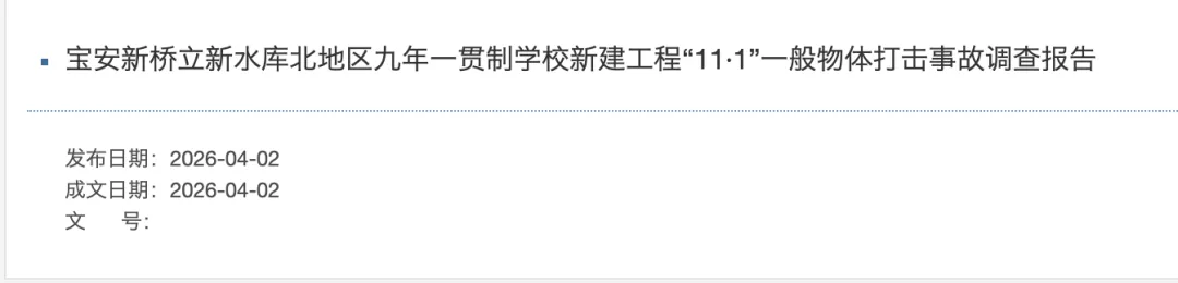 调查组认定,宝安新桥立新水库北地区九年一贯制学校新建工程“11·1”一般物体打击事故是一起因施工现场安全管理不到位而造成的一般生产安全责任事故。